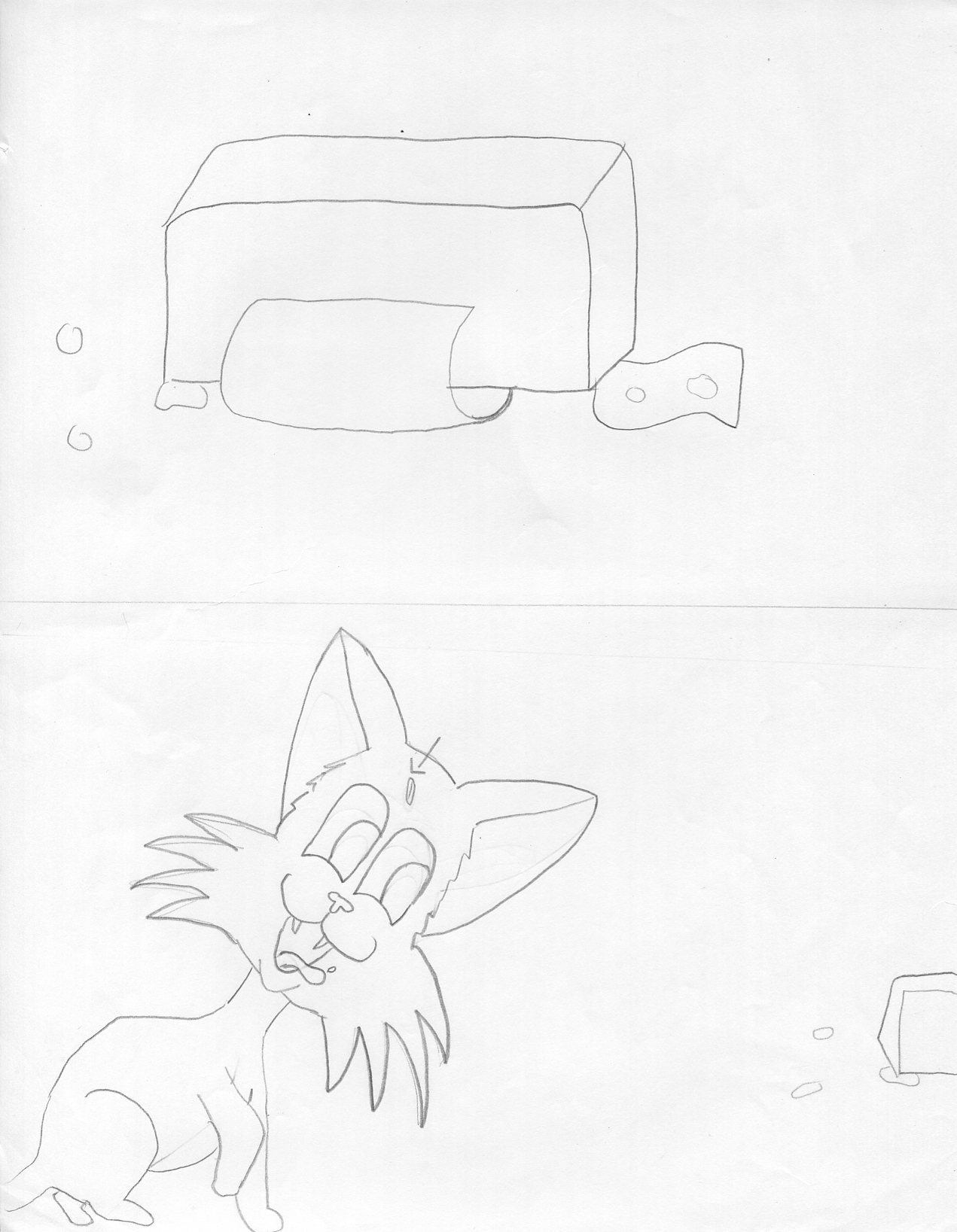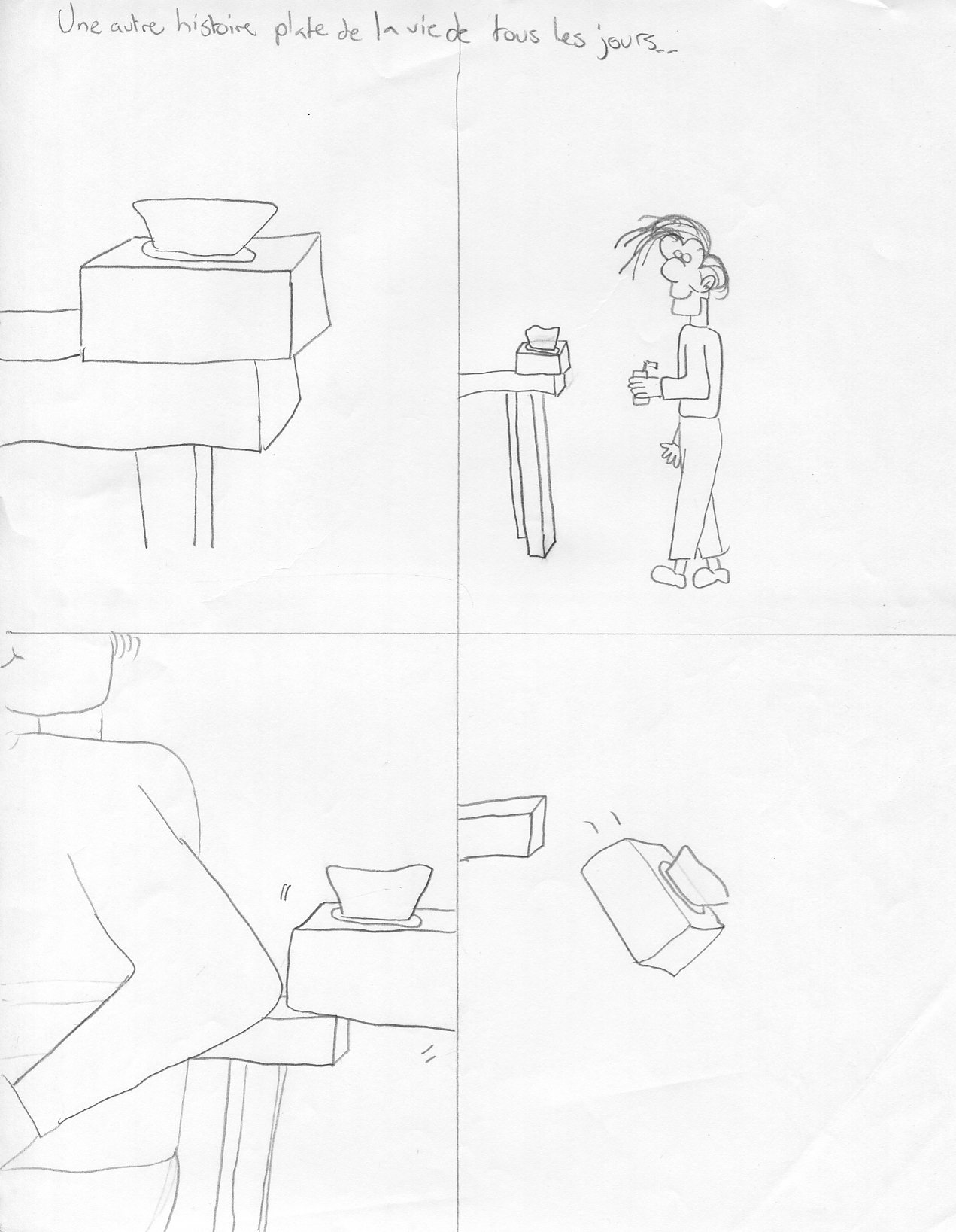 Si vous aviez pas compris, c'est l'histoire d'une boîte de kleenex sur le boîte d'une table qui se fait pousser du coude par un bonhomme. Elle tombe. Le vent que produit la boite de kleenex qui tombe fait revoler un petit grain de riz. Le coin de la boîte atteri pile dans une petite flaque de lait, la flaque de lait fait des gouttes, un kleenex s'échappe de la boîte et atteri sur deux gouttes, la boîte de kleenex s'immobilise au sol et le grain de riz se ramasse dans le front du chat.
