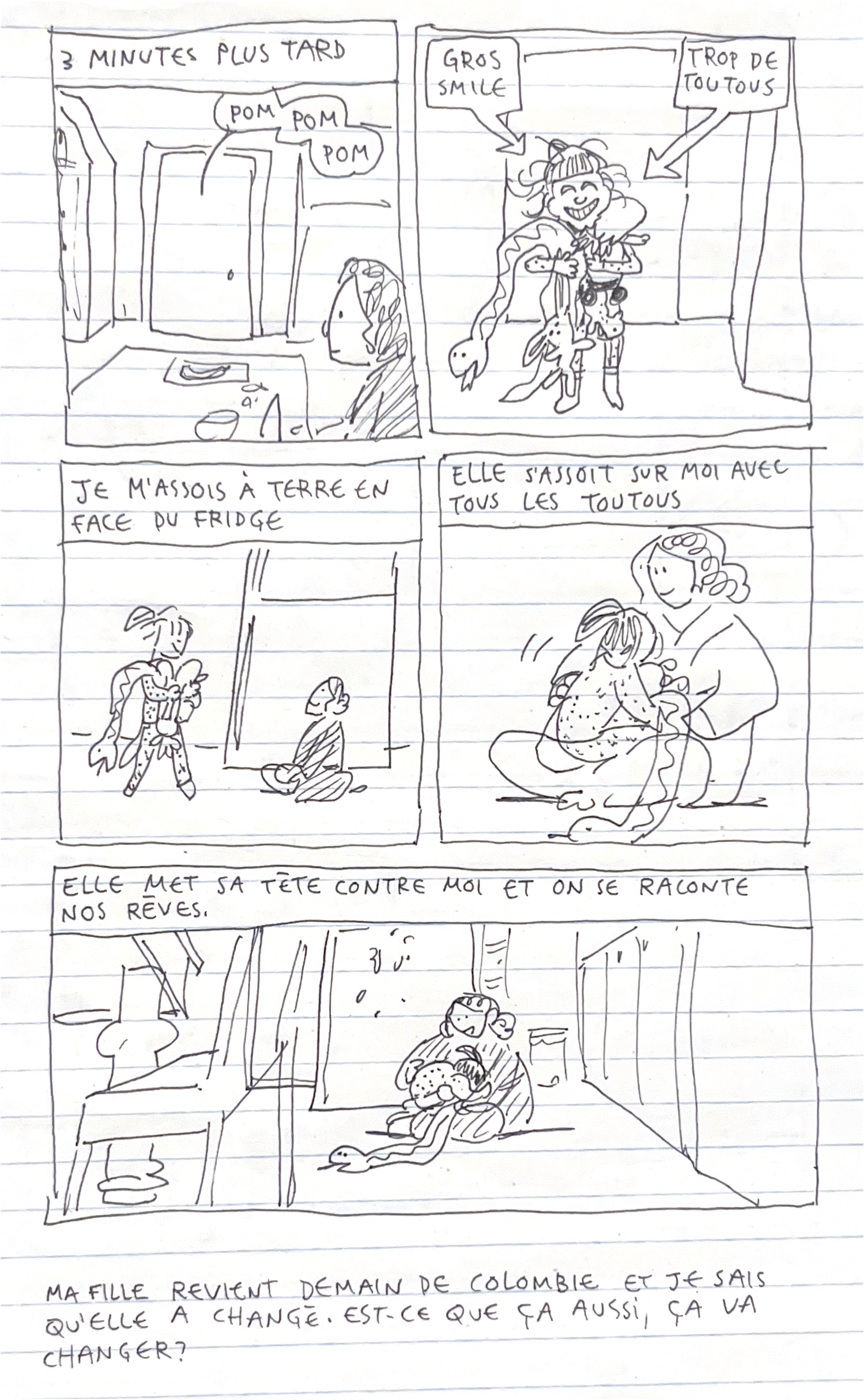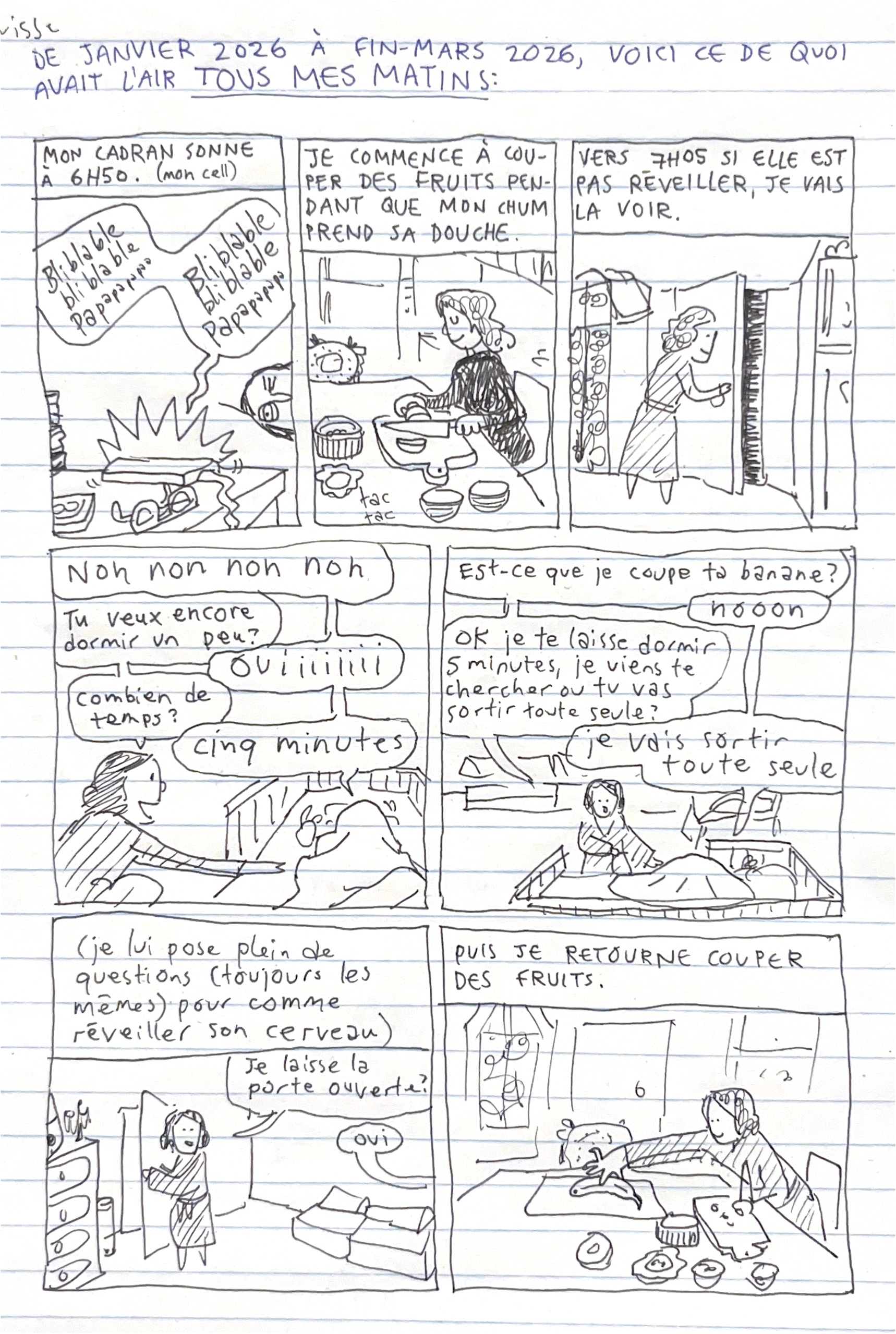 Allo! J’aimerais tellement updater plus souvent ce blogue, j’ai plein de petites BD que j’aimerais faire, je note tout mais je dessine rien parce que je mets tout mon jus de dessin dans Apnée et que quand arrive le soir, je vais juste me coucher, complètement vidée.